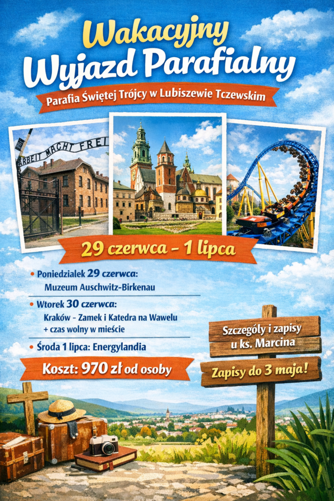 - Serdecznie zapraszamy do wzięcia udziału w tegorocznym wakacyjnym wyjeździe parafialnym. Po bardzo udanym zeszłorocznym pobycie w Energylandii planujemy powtórzyć te pozytywne emocje. Tym razem proponujemy aż trzy dni, które obejmą poniedziałek, wtorek i środę pierwszego tygodnia wakacji tj. 29 czerwca-1 lipca. Pierwszy dzień to emocje bardzo wzniosłe, szalenie ważne dla historycznej i moralnej pamięci, a zatem wizyta w byłym nazistowskim obozie koncentracyjnym Auschwitz-Birkenau. Drugi dzień w całości przeznaczony jest na Kraków, z kompleksowym zwiedzaniem zamku i katedry na Wawelu. Trzeciego dnia docenimy piękno czasów, w którym dane jest nam żyć, doskonale bawiąc się w Energylandii. Koszt wyjazdu obejmujący wszystkie bilety wstępu, przejazd oraz noclegi i wynosi 970 zł od osoby. Koszt może ulec zmianie w zależności od liczby chętnych na wyjazd, w tym dzieci, dla których koszt będzie nieco niższy. Serdecznie prosimy zainteresowanych wyjazdem o kontakt z ks. Marcinem do 3 maja.