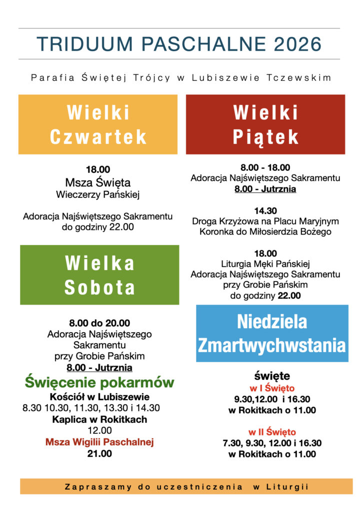 - Od Wielkiego Czwartku rozpoczyna się obchód Triduum Paschalnego. Zapraszamy na Mszę Wieczerzy Pańskiej – o godz. 18.00, a następnie na adoracyjne czuwanie z Panem Jezusem do godz. 22.00.